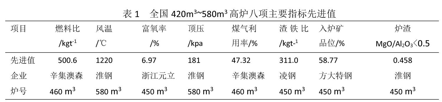 在此级别高炉中,燃料比低于510kg/t的企业有辛集澳森和武安文丰;高风温企业有淮钢,高达1200℃以上;富氧率高于5%的有元立等企业的6座高炉;顶压高于180kPa的仅有淮钢;煤气利用率高于45%的有辛集澳森等企业的8座高炉;渣铁比低于320kg/t的仅有方大特钢和凌钢。在这个级别高炉中,有多座高炉的渣铁比高于500kg/t,其中有3座酒钢本部的450m3高炉;入炉矿品位高于58%的有凌钢的2座高炉,淮钢的2座高炉;炉渣MgO/Al2O3低于0.5的有安钢和淮钢的3座高炉。值得注意的是,辛集澳森公司460m3高炉的操作指标中仅煤气利用率一项指标突出,小高炉就创造了500.6kg/t低燃料比的佳绩,说明小高炉值得重视炉内操作,提高煤气利用率。