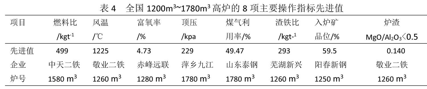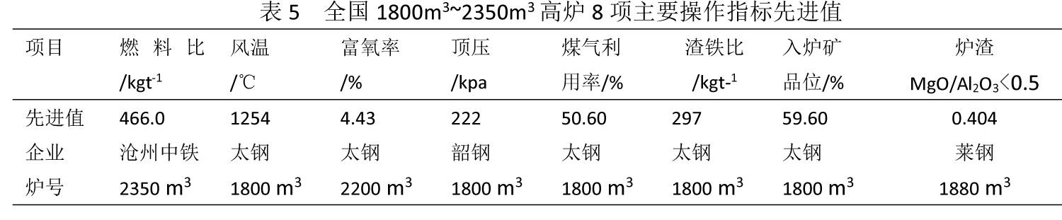 在此级别高炉中,沧州中铁的2350m3高炉燃料比最低,该企业3座此级别高炉平均燃料比均低于470kg/t,这是我国高炉炼铁界罕见的低燃料比指标,其特点是入炉矿品位>58%,渣铁比<300kg/t,烧结矿的质量指标也很优良,高品位和低SiO2、低MgO、低Al2O3,但风温和煤气利用率并不高,取得这样的燃料比是难能可贵的。尤为难得的是,在此级别高炉中,8项高炉操作指标的最优值太钢独揽4项,高风温、高煤气利用率、高入炉矿品位、低渣铁比,太钢高炉工作者为此付出了努力,做出这样可圈可点的优异成绩。莱钢1880m3的高炉炉渣MgO/Al2O3低至0.404,这是莱钢一贯的高炉操作特点,可以通过技术交流推广这一高炉操作经验。
