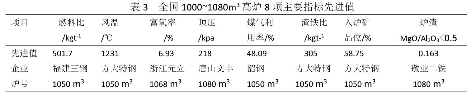 在此级别高炉中,方大特钢的2座1050m3高炉有3项指标居全国之首,这2座高炉入炉矿品位高达58.75%,渣铁比低于305kg/t,热风温度达到1231℃,使燃料比也低于516kg/t,甚至有1座高炉的燃料比低至504kg/t。在这一级别高炉中,燃料比最低的是福建三明钢铁的高炉,平均为501.7kg/t。该公司燃料比低不是偶然的,是各项主要操作指标都很先进的结果。其风温>1220℃,入炉矿品位高于57.5%,顶压>185kPa,煤气利用率平均达到47%,烧结矿的质量无论含铁品位还是MgO、Al2O3含量以及碱度均控制在最佳范围内,甚至超过了国内2500m3级别高炉的操作水平。敬业二铁2座1080m3高炉炉渣的MgO/Al2O3低至0.163,这种低MgO/Al2O3的高炉操作经验值得总结推广。敬业二铁如果在精料和烧结矿质量方面再跨越一步,对高炉指标的进步更有价值。