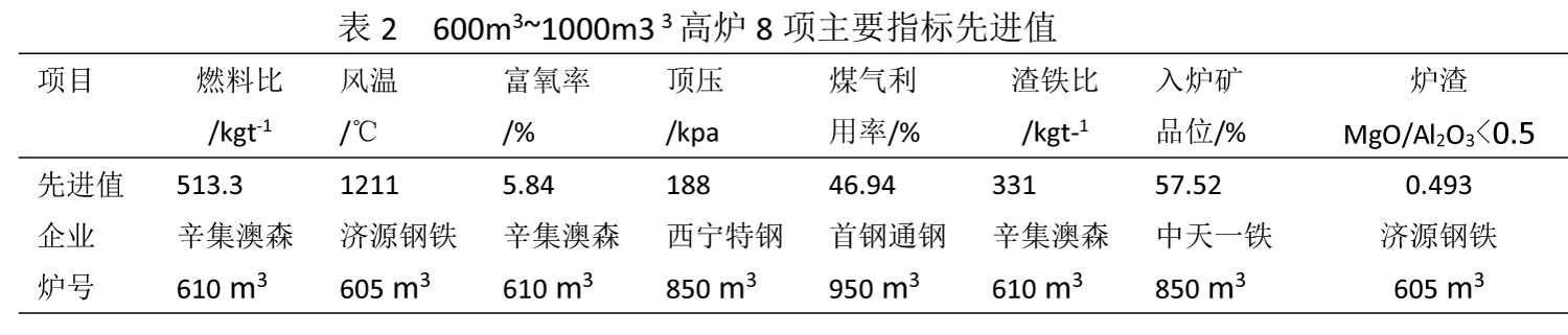在此级别高炉中,辛集澳森的2座610m3高炉在燃料比、富氧率和渣铁比3项指标上都领先;济源钢铁的605m3高炉风温和炉渣MgO/Al2O3两项指标领先;入炉矿品位方面,天一钢铁以57.52%领先;西宁特钢的顶压188kPa为此级别高炉最佳值。辛集澳森610m3小高炉燃料比依然最佳,说明该企业重视降低燃料比,高炉操作得法,值得总结和推广经验。