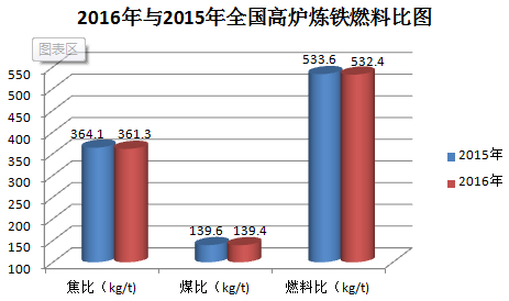 2016年,344座高炉(420m3~5800m3)的统计数据显示,全国高炉炼铁燃料比(含焦比和煤比)有所下降,由2015年275座高炉的平均焦比364.1kg/t下降为361.3kg/t,煤比由139.6kg/t下降为139.4kg/t,燃料比由533.6kg/t下降为532.4kg/t。2016年焦比、煤比和燃料比下降的幅度不大,下降的原因与入炉矿品位的提高(由2015年的56.68%提高到56.85%)、渣铁比下降(由2015年的369kg/t下降为2016年的348kg/t)、富氧率和顶压的提高等因素有关。