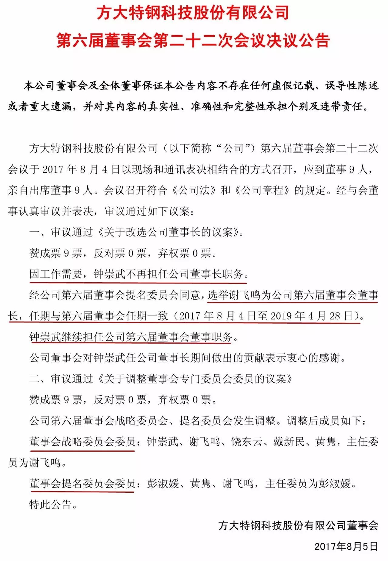 《议案》表示,经公司第六届董事会提名委员会同意,选举谢飞鸣为公司第六届董事会董事长,任期与第六届董事会任期一致(2017年8月4日至 2019年4月28日);因工作需要,钟崇武不再担任公司董事长职务,但继续担任公司第六届董事会董事职务。
